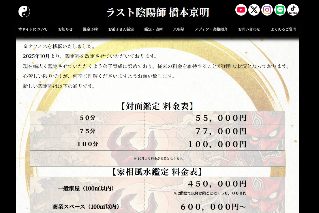 ちなみに、2025年10月からさらに鑑定料金が改定され、50分・55,000円とのこと!仮装風水鑑定はなんと45万円です。