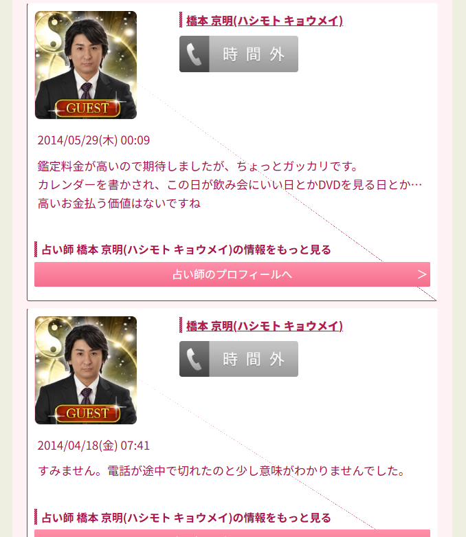 この相談ですが、橋本京明さんは高額、忙しいということで3名のお弟子さんによる鑑定も用意されていました。さらに、提携占い師さん3名もいらっしゃいます。