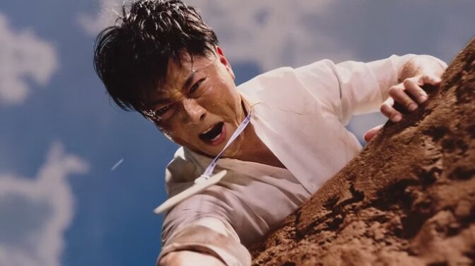 50歳(2025年当時)とは思えないキレのある動きで、スーツ姿のままビジネスの困難を崖に見立てて登り、渾身の「ファイト イッパーツ!」を披露。