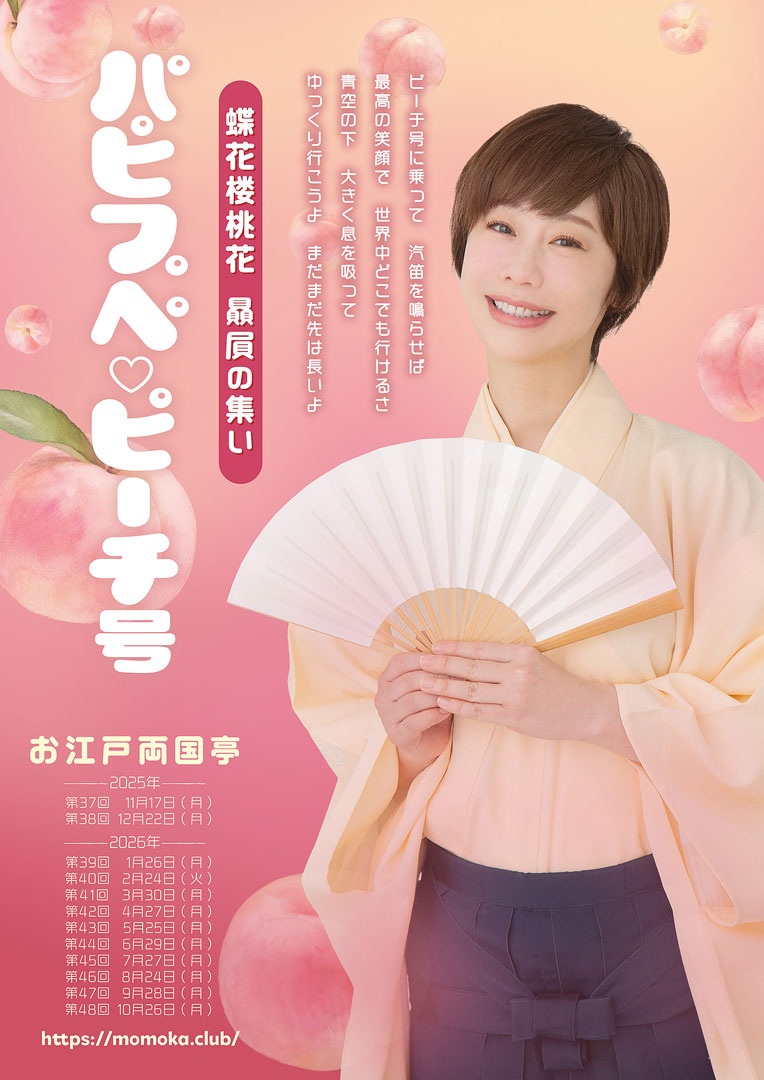 定期独演会「パピプペ♡ピーチ号」 桃花さんの落語をじっくり堪能できる、ファン必見の定期公演です。2026年も毎月開催されており、新ネタの披露や、ここでしか聞けない舞台裏のトークも魅力のひとつ。桃花さんの成長を間近で見守り続けたい「追っかけ」ファンが集まる場所となっています。